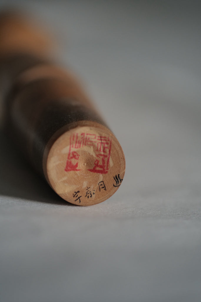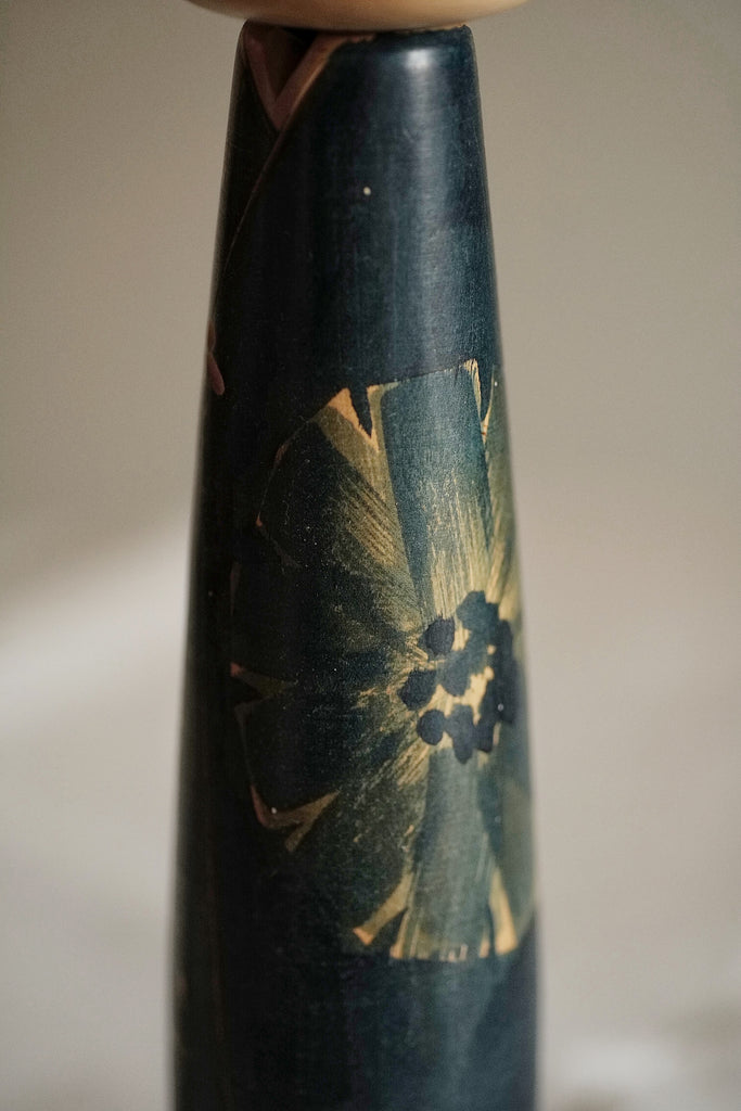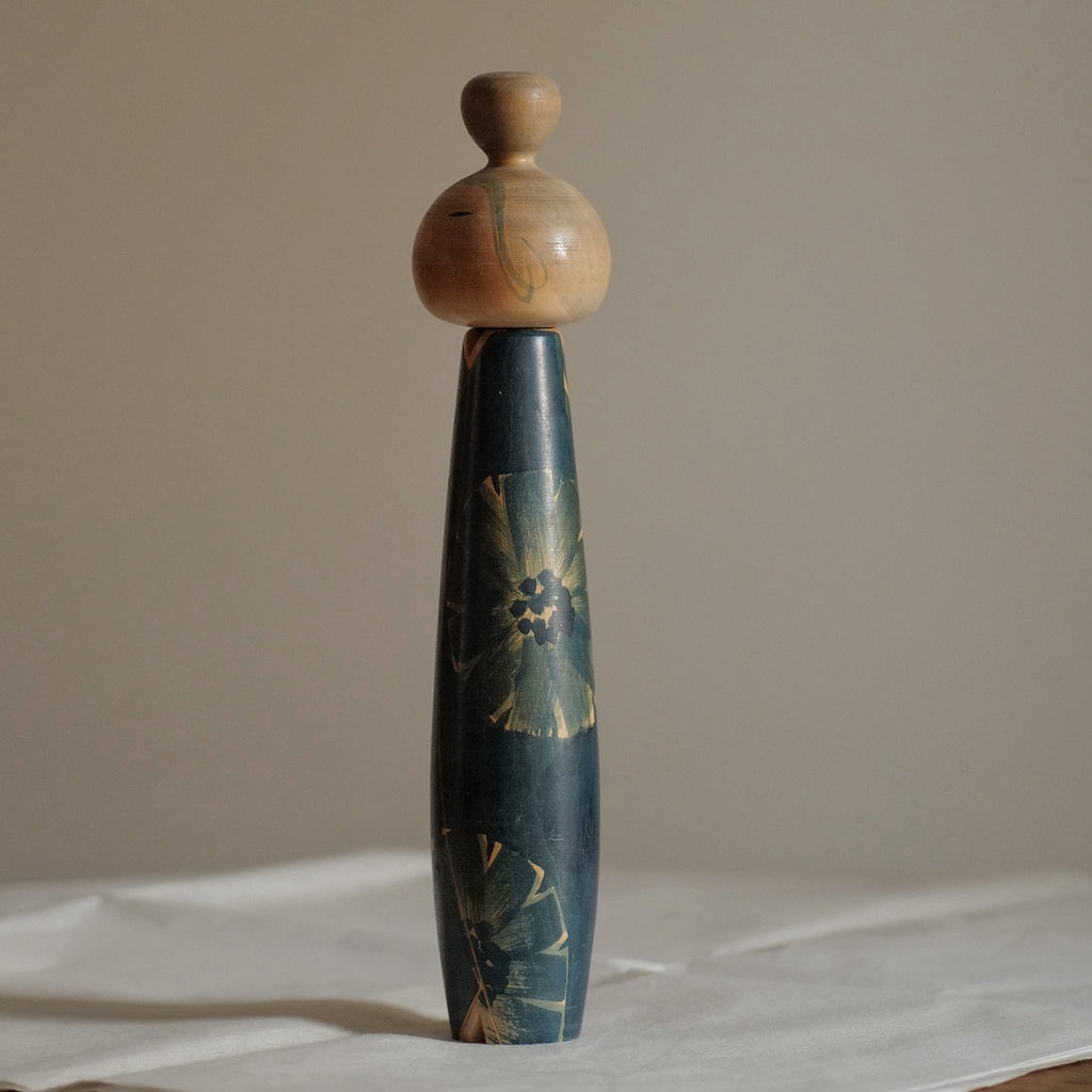 Kokeshi vintage longiligne, au kimono indigo, réalisée par Issetsu Kuribayashi (1924-2011) originaire de Yonezawa, il a débuté sa carrière en 1955 et est considéré comme étant l’un des pères du style Sosaku et a remporté de nombreux prix.
