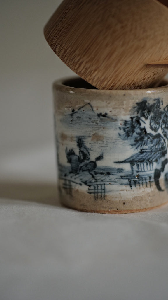 Futaoki vintage Kyo-Yaki, bleu et blanc, peint à la main. Il a été réalisé par Terao Tosho.