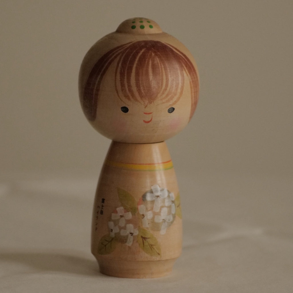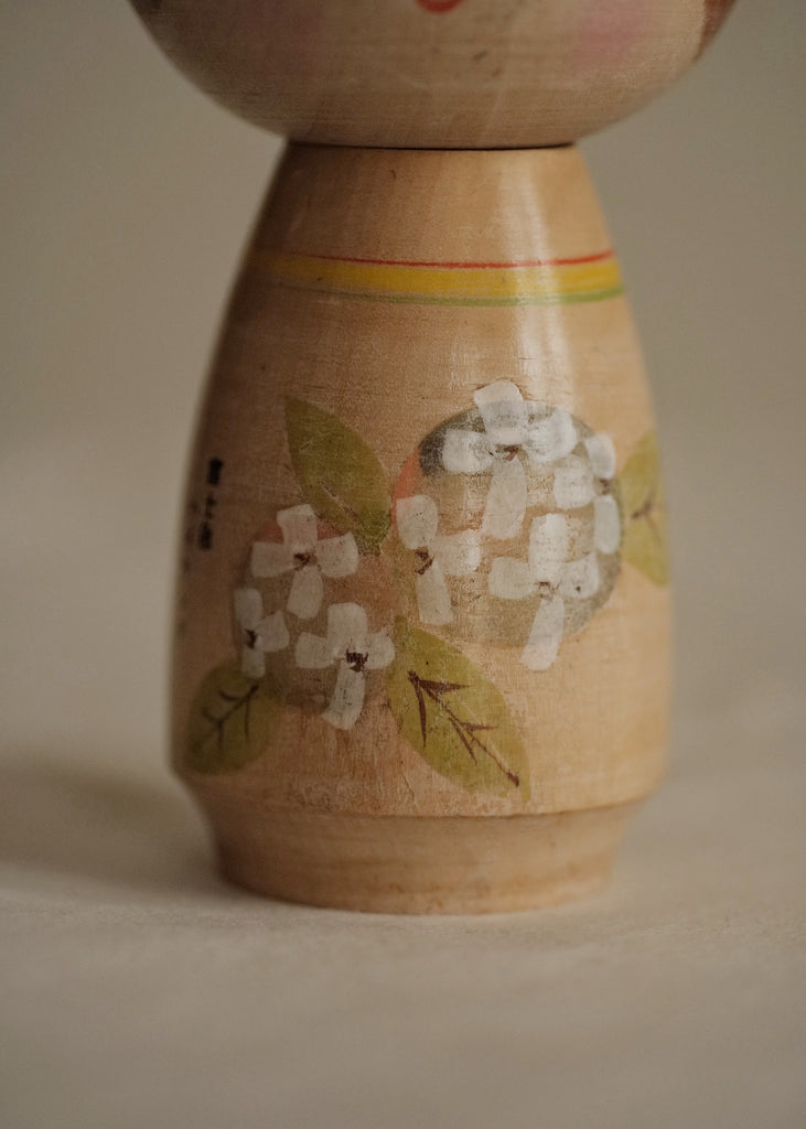 Kokeshi vintage, au style joliment rétro, souvenir de Fuji-Kyu., illustrée d'hortensias.