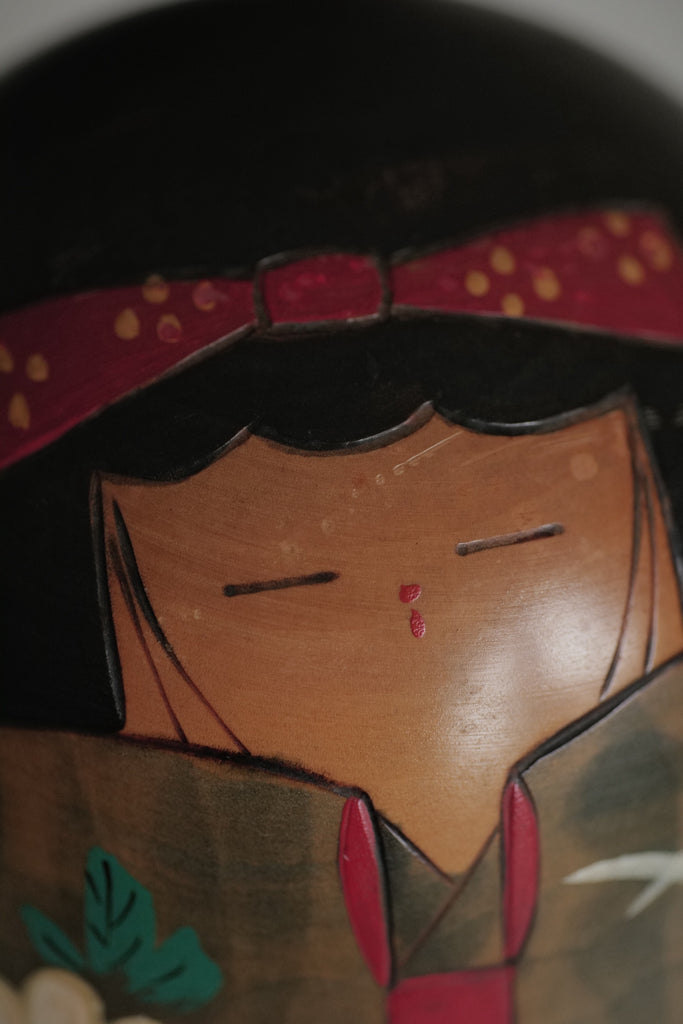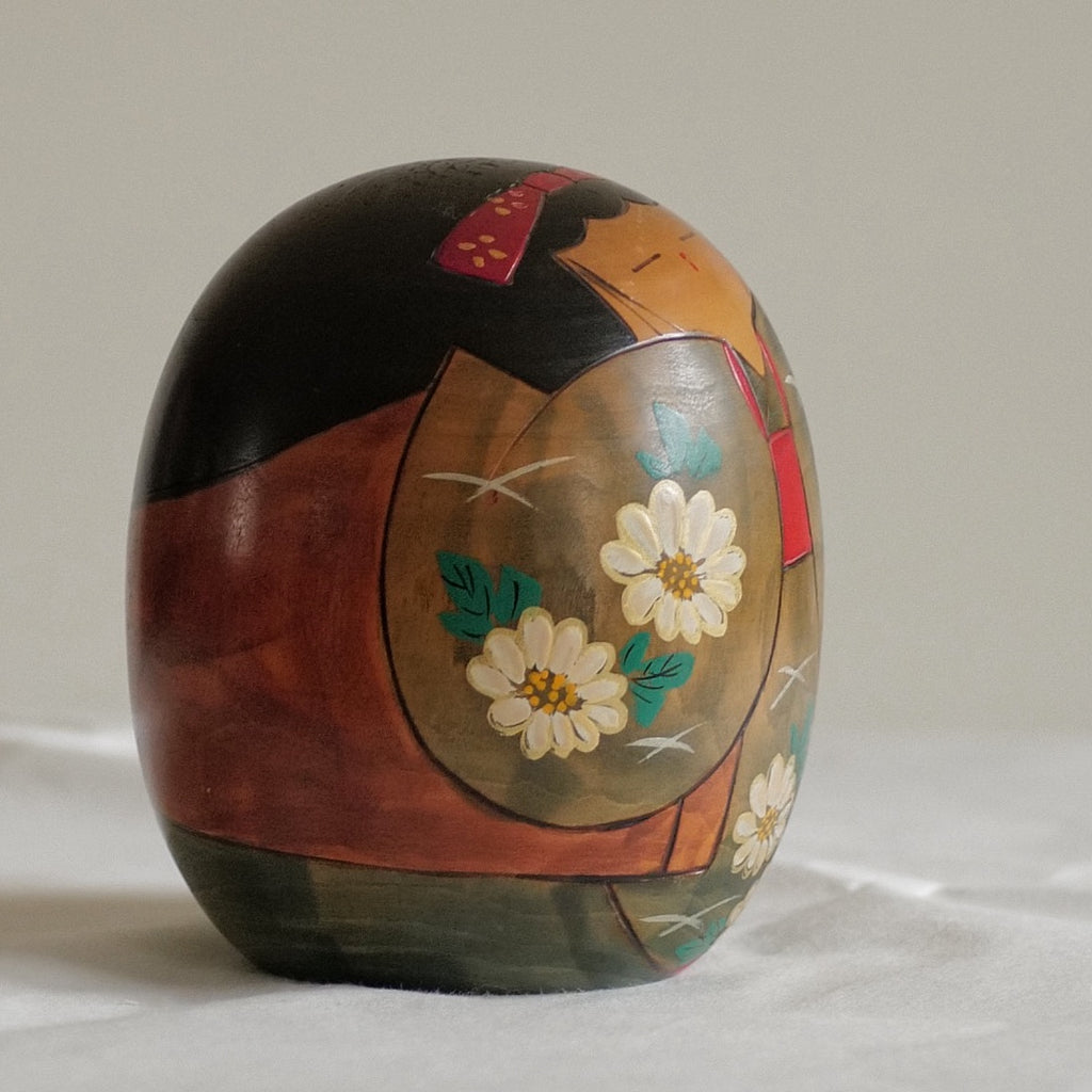 Kokeshi vintage ovoïde relativement massive, intitulée “chrysanthèmes sauvages” (elle a remporté le prix du premier ministre).