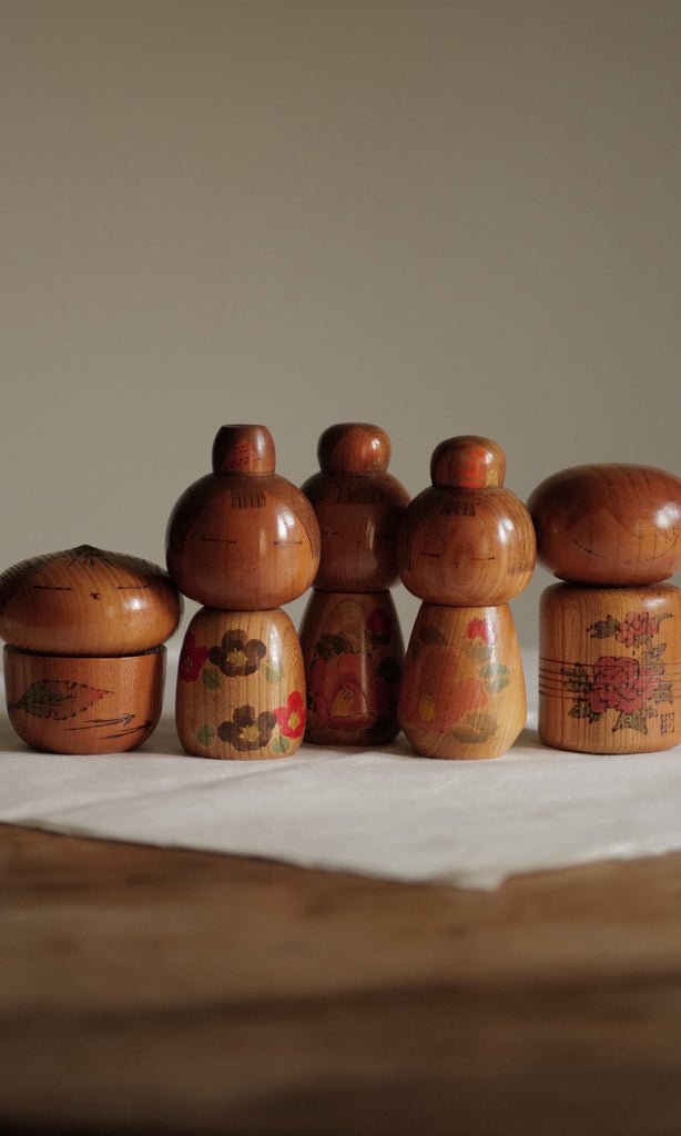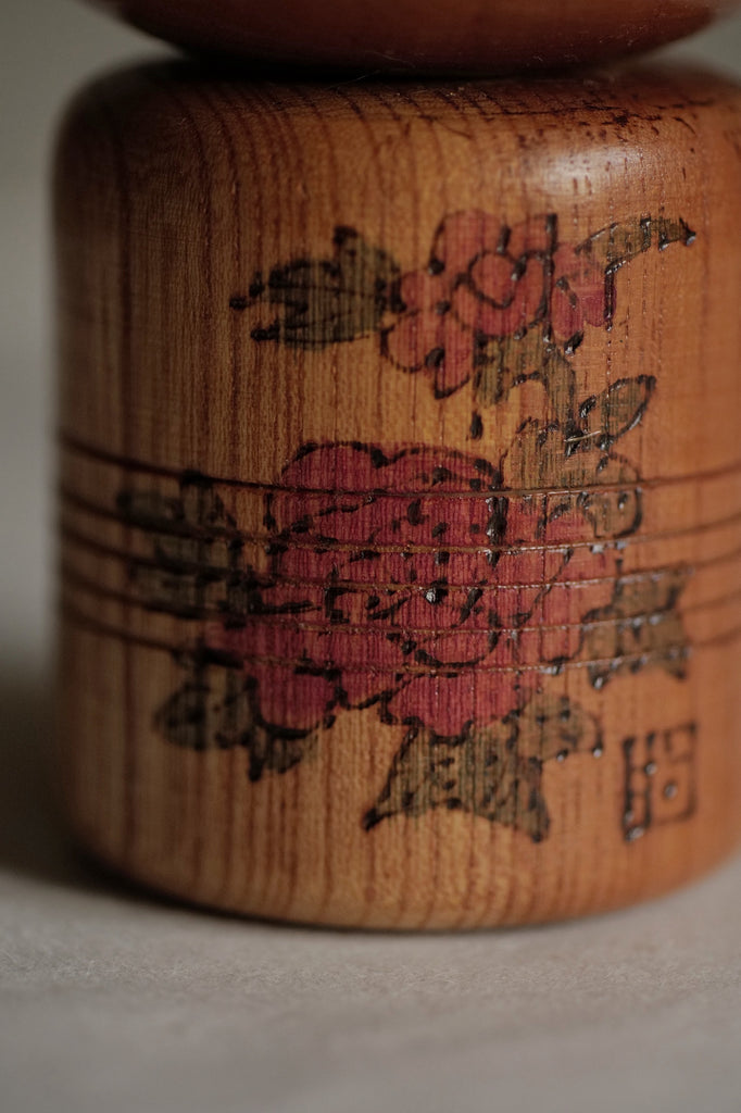 Kokeshi vintage au style minimaliste, ornée d’une pivoine, réalisée par Tanaka Harumasa.