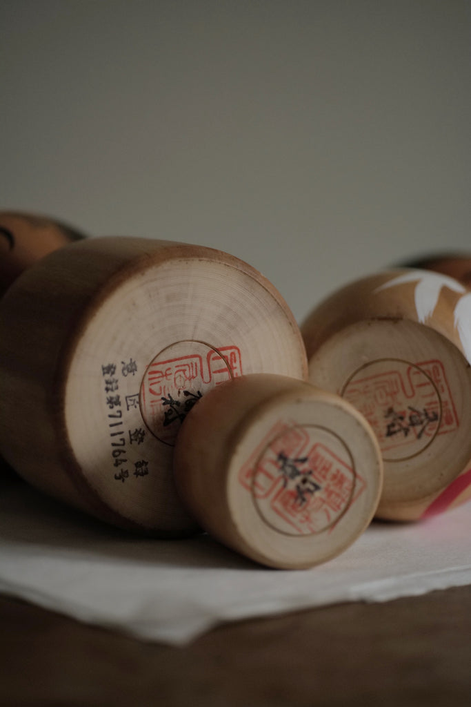 Très jolie famille de kokeshi vintage au style rétro. Leurs têtes sont amovibles, vous pouvez les positionner comme bon vous semble.
